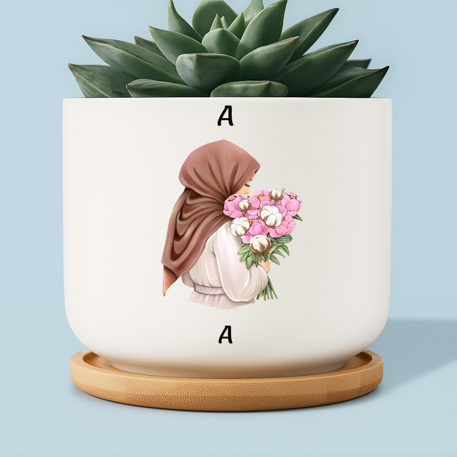 This charming personalized ceramic planter is a beautiful gift for a loved one, featuring a graceful hijabi girl holding a bouquet of soft pink flowers. The Arabic phrase reads: