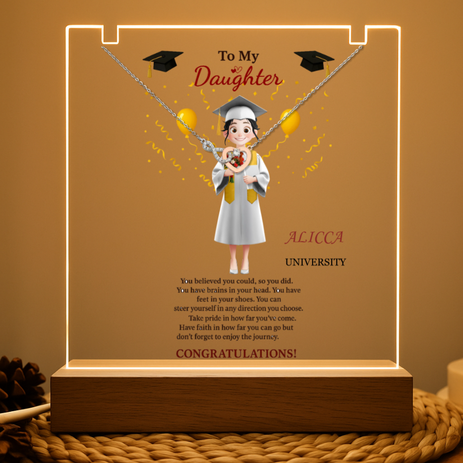 Honor your graduate with this glowing, custom acrylic light – a keepsake that celebrates their hard work and bright future. Whether it's your daughter, son, bestie, or student, this design is fully customizable with a graduation character, their name, and a heartfelt message from you.
