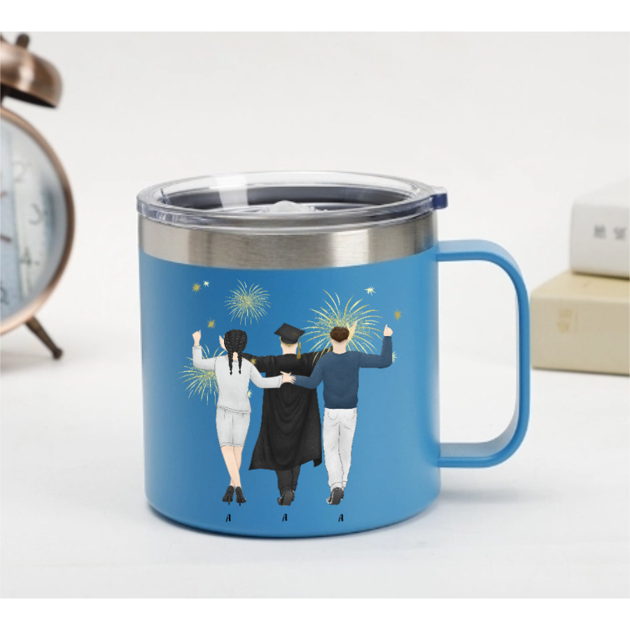 Celebrate the joy of graduation with this fully personalized mug. Add three characters, choose their outfits and hairstyles, and enjoy the back-pose illustration under celebratory fireworks.