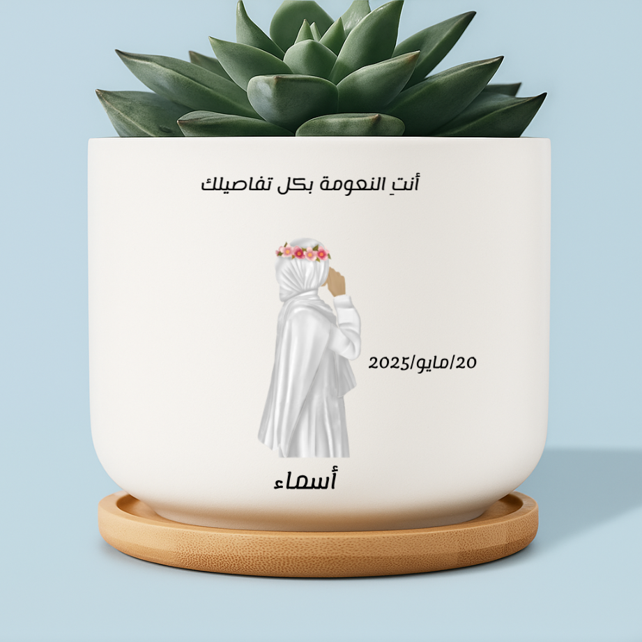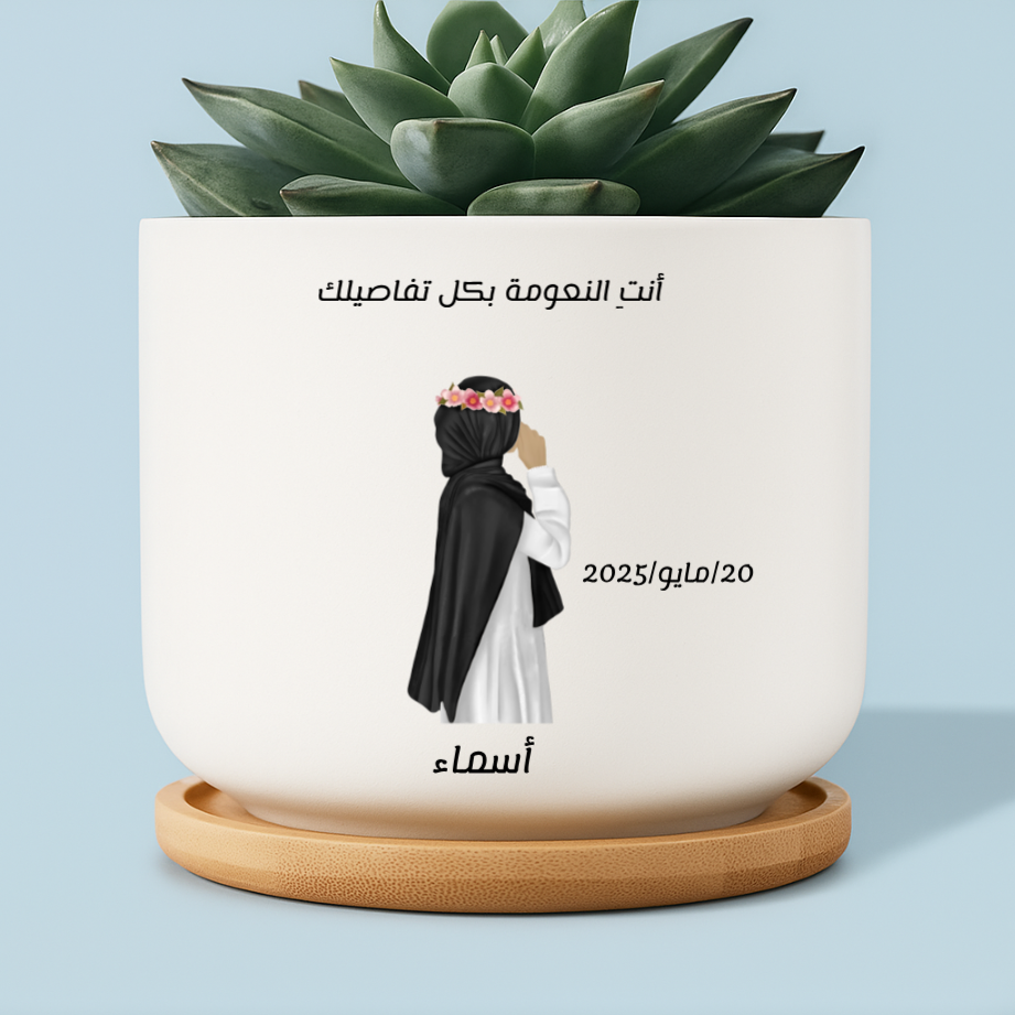 A charming customized plant pot featuring an illustrated hijabi girl with a flower crown, personalized name, and date. The Arabic text reads: