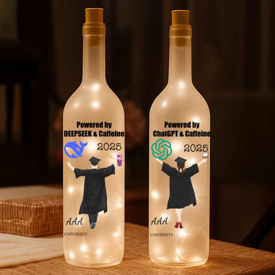 Celebrate academic victory with a spark of humor and glow! Our “Powered by ChatGPT & Caffeine” bottle lamp is a modern tribute to the digital-age grad. Featuring personalized characters, your university name, and class year, this quirky design is perfect for coffee-fueled achievers and AI-loving students.